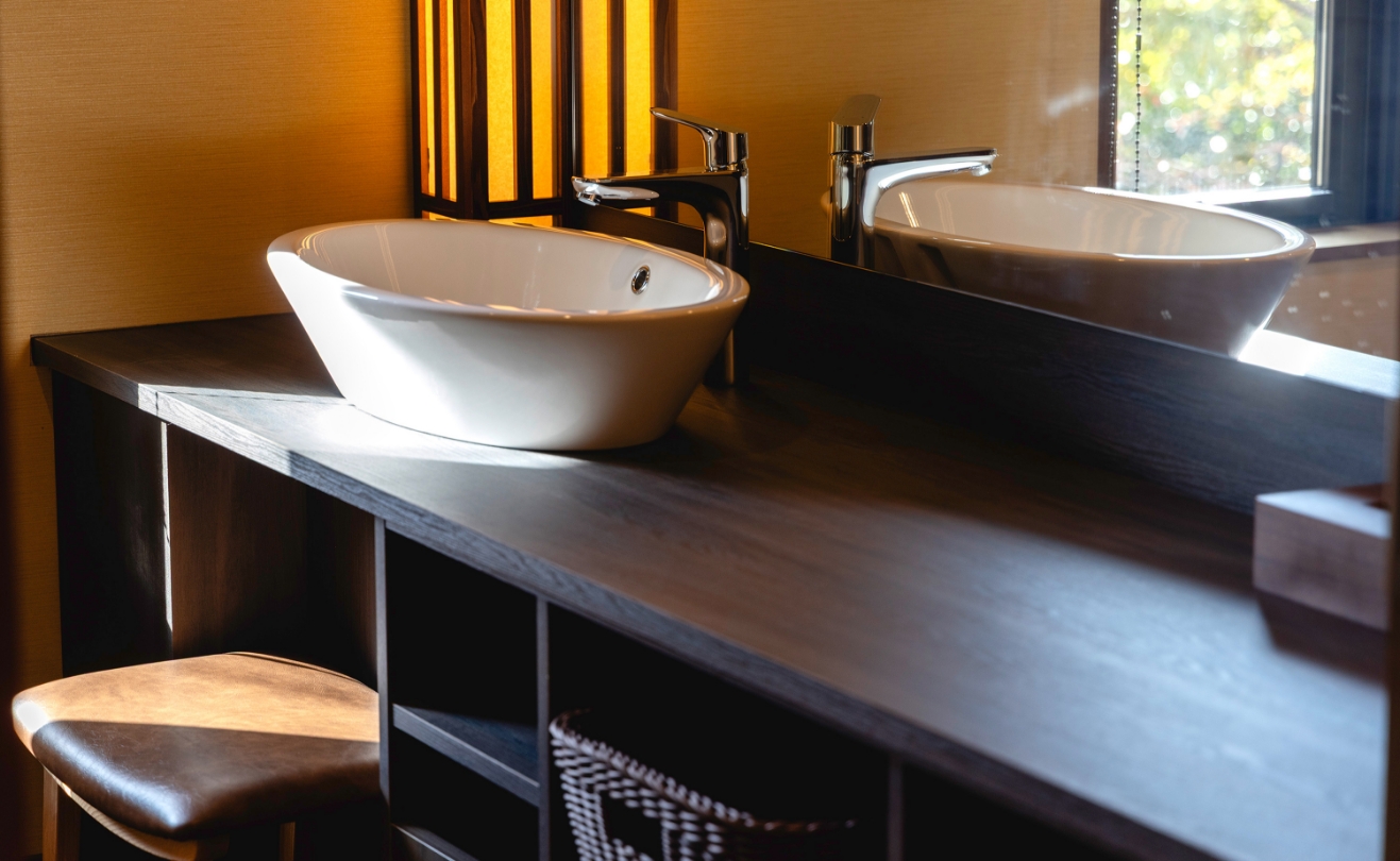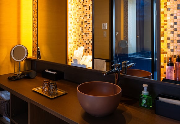 お客様に心地よいひとときをお過ごしいただけるよう、こだわりのアメニティをご用意しております。客室には当館オリジナルのシャンプーやトリートメントをはじめ、上質なバスアメニティを取り揃えました。やさしい香りと使い心地にこだわったアイテムが、旅の疲れを癒し、より豊かなリラックスタイムを演出いたします。